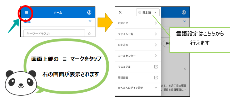 ホーム画面右上の「人型アイコン」の下にある「∨(下向きの矢印)」ボタンをタップすると、登録済みのID(兄弟姉妹など)を切り替えて表示できます。 それぞれのIDに対応したメッセージや設定内容が表示されますので、必要に応じて切り替えてご利用ください。