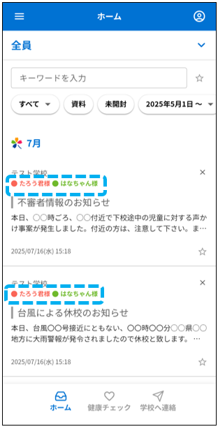 メッセージがどのお子様宛てかを視覚的に分かりやすく表示することができます。