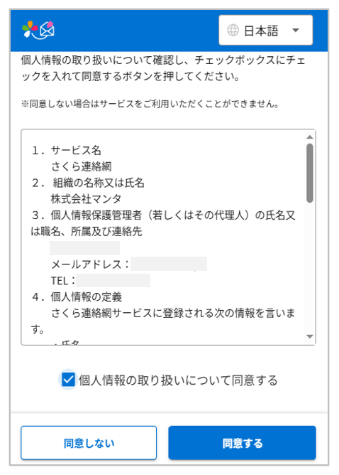 個人情報取り扱いに関する規約が表示された場合は内容を確認のうえ、チェックを入れて同意ボタンをタップしてください