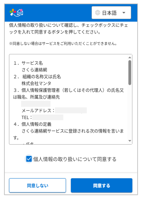 個人情報取り扱いに関する規約が表示された場合は内容を確認のうえ、チェックを入れて同意ボタンをタップしてください